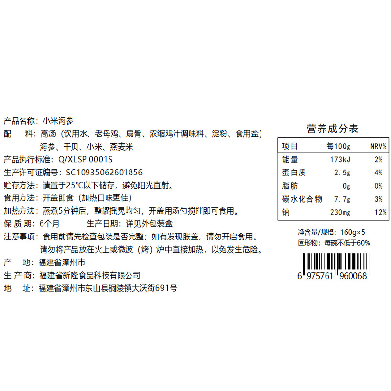 วัตถุดิบ: น้ำสต๊อก (น้ำดื่ม ไก่แก่ กระดูกแฟนหมู น้ำสต๊อกไก่เข้มข้น แป้ง เกลือบริโภค) ปลิงทะเล หอยเชลล์ ข้าวฟ่าง ข้าวโอ๊ต