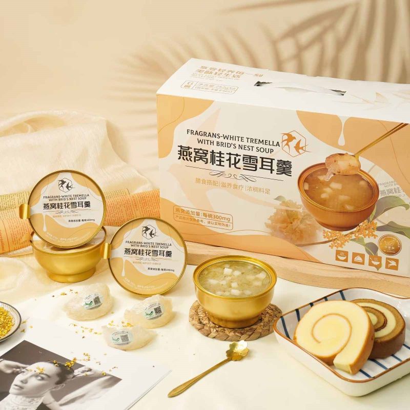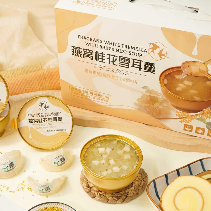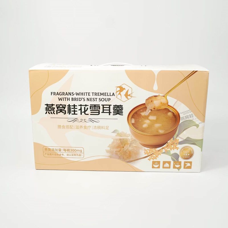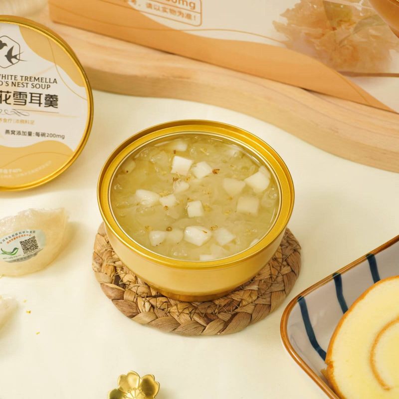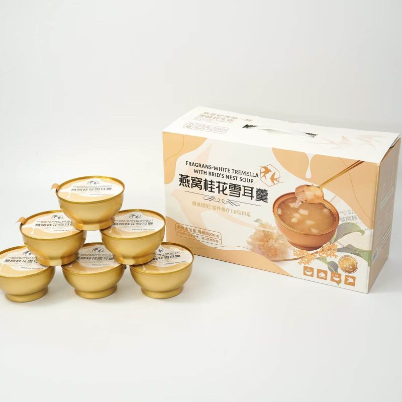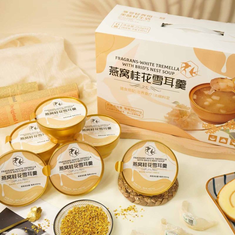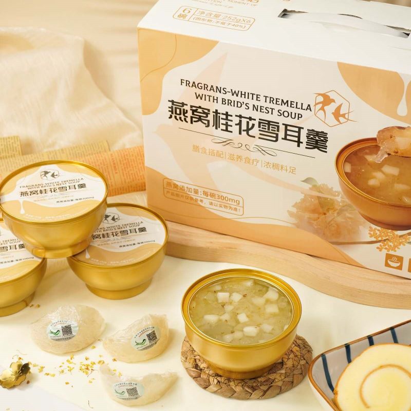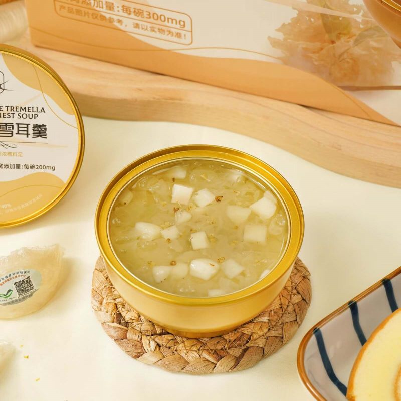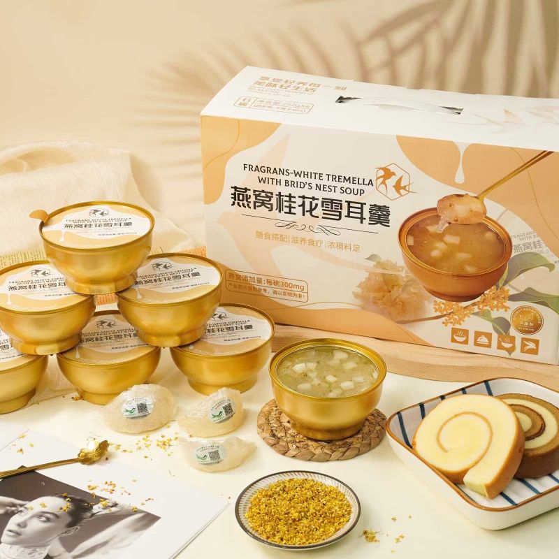 Nutritious Fragrans White Tremella พร้อมซุปรังนกเป็นกล่องของขวัญแสนอร่อยที่สร้างสรรค์อย่างพิถีพิถันด้วยคุณค่าทางโภชนาการที่ผสมผสานสาระสำคัญของเชื้อราขาวและรังนกเข้าด้วยกัน เพื่อมอบขนมที่อร่อยและดีต่อสุขภาพให้กับคุณ ใช้เชื้อราขาวคุณภาพสูงซึ่งอุดมไปด้วยคอลลอยด์ โปรตีน และธาตุต่างๆ มีผลให้ความชุ่มชื้นแก่ผิวและเสริมสารอาหาร เมื่อจับคู่กับรังนกอันล้ำค่า จะนำสารอาหารและความงามตามธรรมชาติมาสู่คุณ ทำให้เป็นทางเลือกที่ดีเยี่ยมสำหรับสุขภาพและความสมบูรณ์แข็งแรง